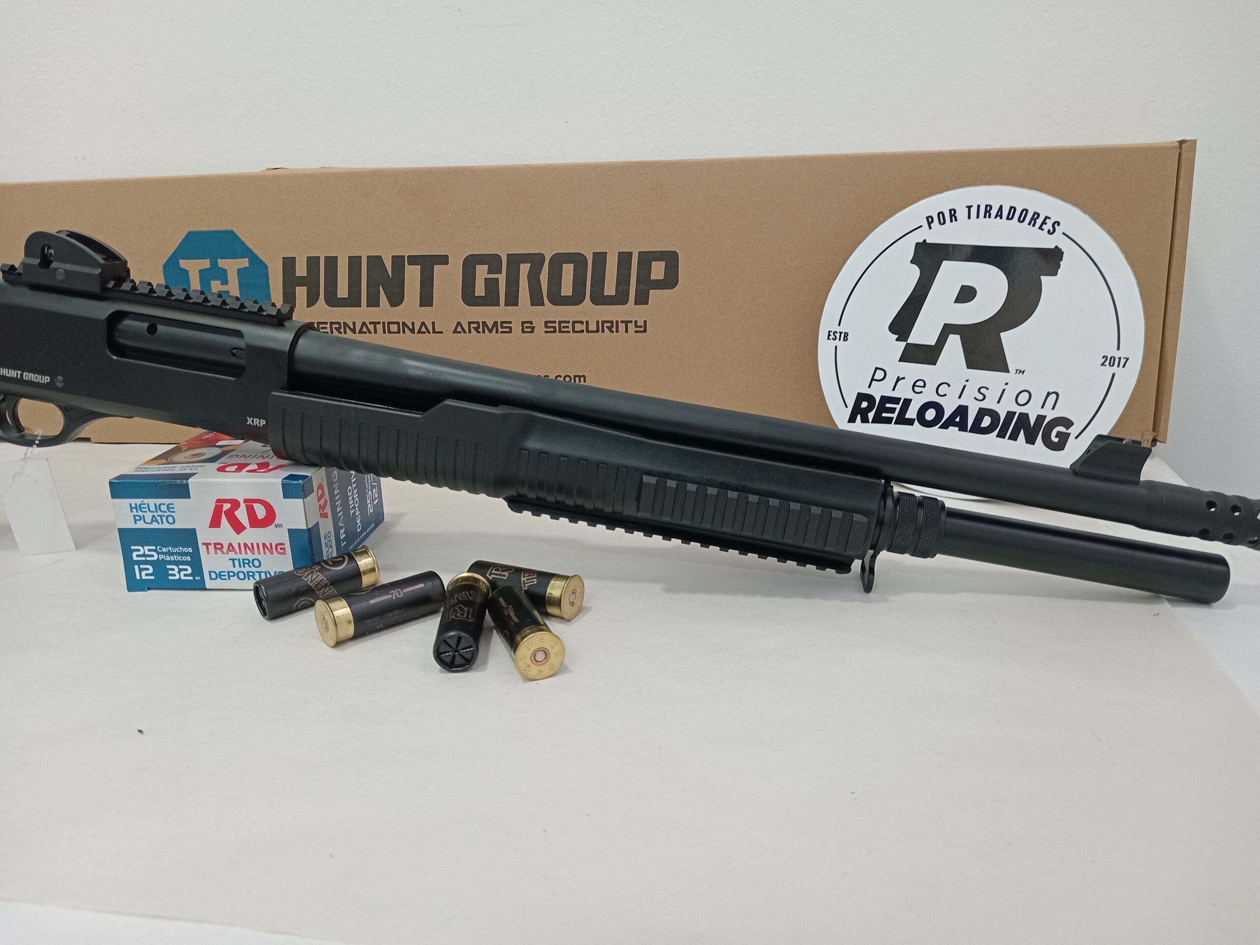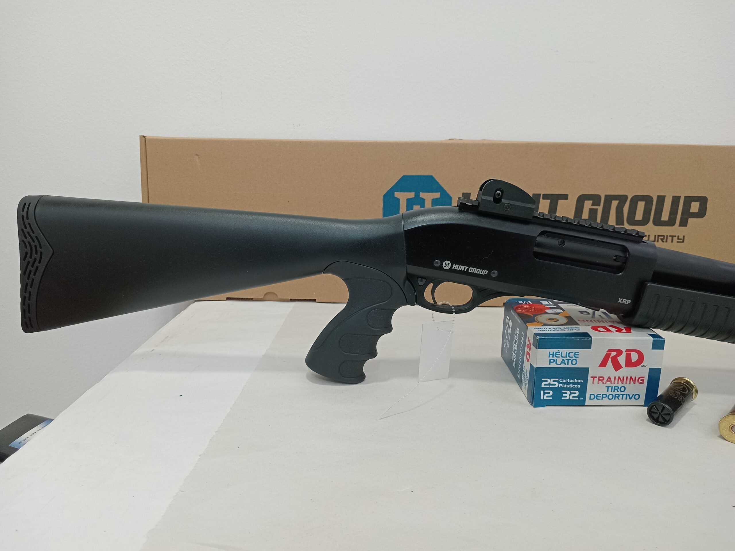 Escopeta de repetición Hunt Group XRP-002 calibre 1276. Terminación pavon/sintético. Capacidad 6+1. Cañon de 470mm. Culata con pistol grip. Chimaza larga con rieles picatinny. Riel superior, alza ortóptica. Caño con apagallama.