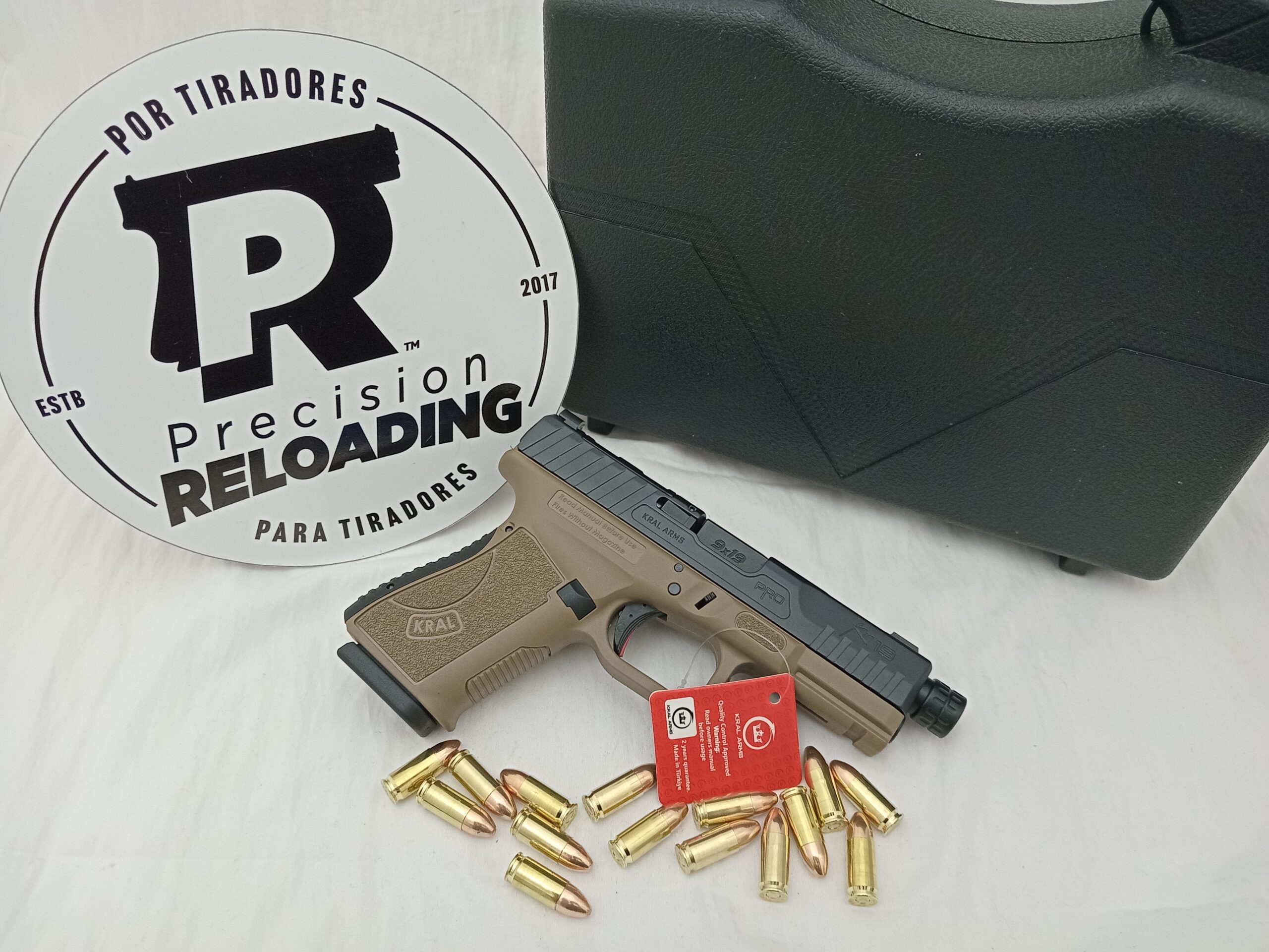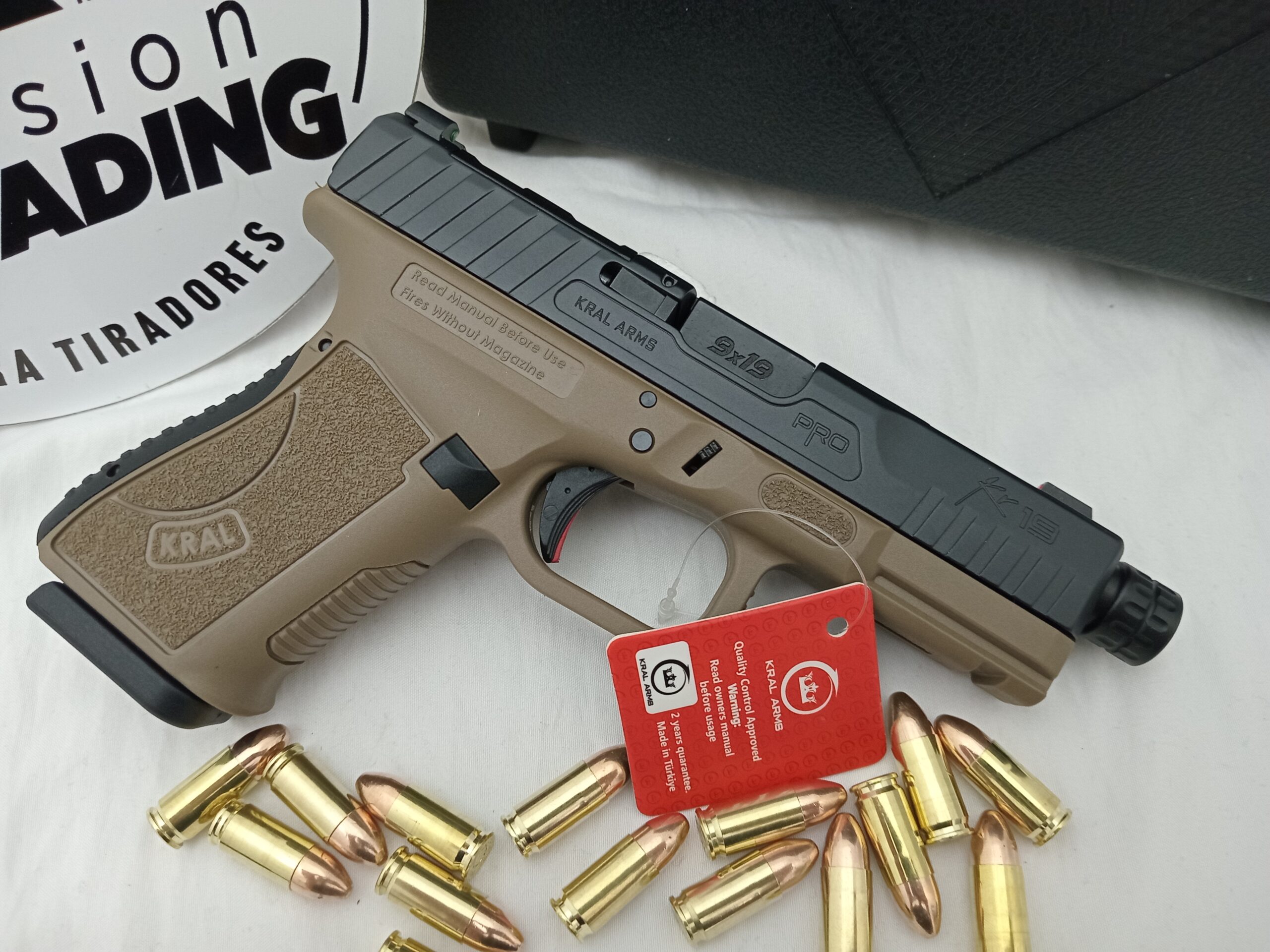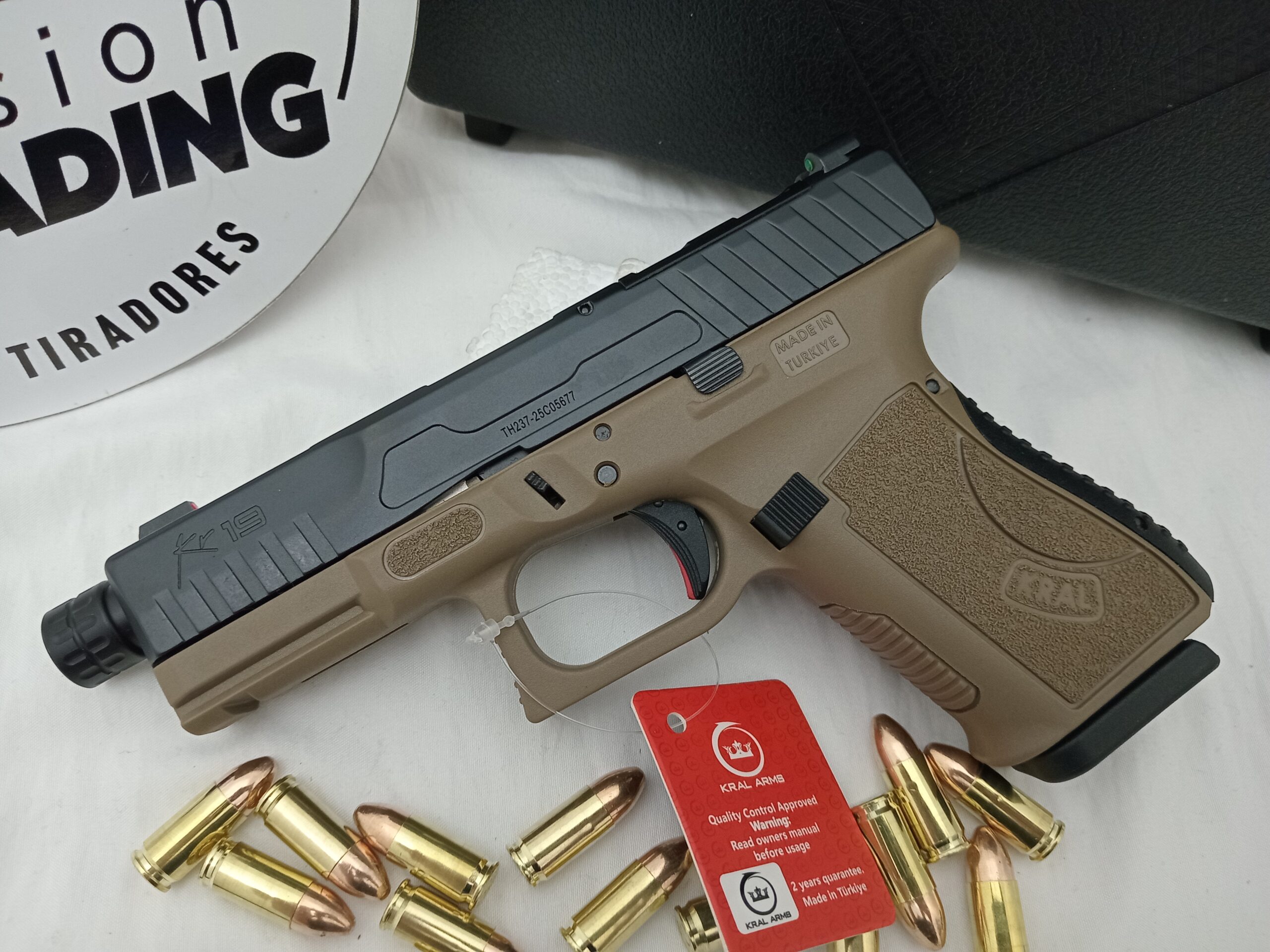 Pistola Kral Arms KR19 PRO FDE. Clon Glock 19. Calibre 9mm. Caño roscado. Dos cargadores de 15 disparos. Miras de fibra. Preparada para montar mira holográfica. Backstraps intercambiables, incluye embudo. Kit de limpieza completo